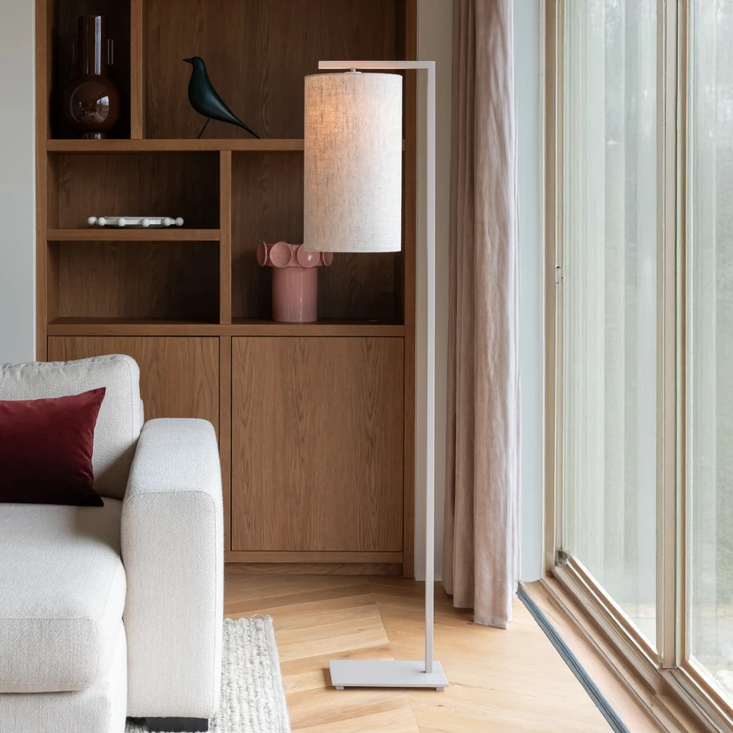 Die Stehlampe Boston besteht aus einem hohen, stabilen Eisengestell in Schwarz und einem blickdichten Schirm aus Textil. Dieser ist zylindrisch geformt und gibt dank der Beschaffenheit ein sehr diffuses Licht ab, das für eine angenehme Stimmung im Raum sorgt. Bedient wird sie mühelos über einen Schalter.