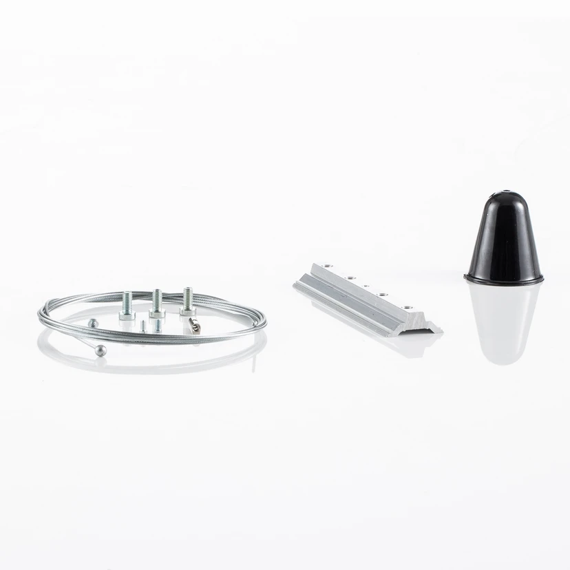 Dieses Aufhängungskit mit 200 cm Stahlseil, Baldachin und 12 cm langer Verbindungsplatte ermöglicht die abgehängte Montage von Ivela LKM 3-Phasen-Stromschienen.