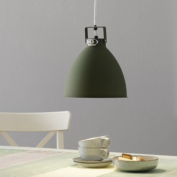 Liebhaber des Vintage-Stils kommen mit der Hängeleuchte Augustin auf jeden Fall auf Ihre Kosten. Mit ihrem schnörkellosen und derben Design erinnert die Leuchte an Fabrikhallen und Werkstätten des vergangen Jahrhunderts. Der Schirm der Leuchte besteht aus Aluminium und hat eine Glockenform, wodurch sich Augustin besonders zur Ausleuchtung eines Esstisches oder einer Bar eignet. Die weiße Lackierung im Inneren des Schirms dient als Reflektor für eine helle Lichtentwicklung. Abgerundet wird das Design durch einen farblich zum Schirm passenden Baldachin sowie einem Textilkabel.