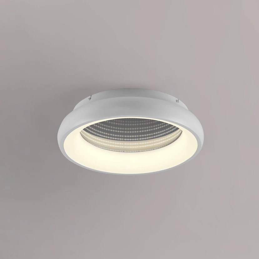 Speccio ist eine runde LED-Deckenleuchte aus Metall, die durch ihre besondere Gestaltung auffällt. Sie ist mit zwei Lichtelementen bestückt - einem LED-Board hinter dem satinierten Ring im unteren Bereich der Leuchte sowie weiteren LEDs im sich nach oben verjüngenden Innern des Schirmes. Dies verleiht der Leuchte eine enorme Tiefe. Per mitgelieferter Fernbedienung lassen sich die beiden Lichtelemente getrennt oder zusammen einschalten, zusätzlich kann die Beleuchtung gedimmt werden. Diese Funktionalität ermöglicht immer die passende Beleuchtung im Raum.