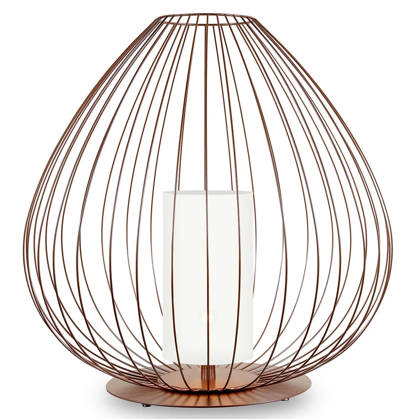 Entworfen vom italienischen Designer Matteo Ugolini, erinnert diese Bodenleuchte Cell an die jahrtausendealten chinesischen Papierlaternen, die filigran in die Lüfte empor stiegen. Die Bodenleuchte Cell ist trotz ihrer bauchigen Form sehr zart und grazil gestaltet. Der Käfig aus Edelstahlstäben umschließt einen zylindrischen Leuchtenschirm aus weißem Kunststoff und lässt das Licht des Leuchtmittels sanft und blendfrei in die Umgebung scheinen. Der Glanz des Lichtscheins wird dabei vom Bronze-Finish des Käfigs verstärkt und setzt stilvolle Lichtakzente.
