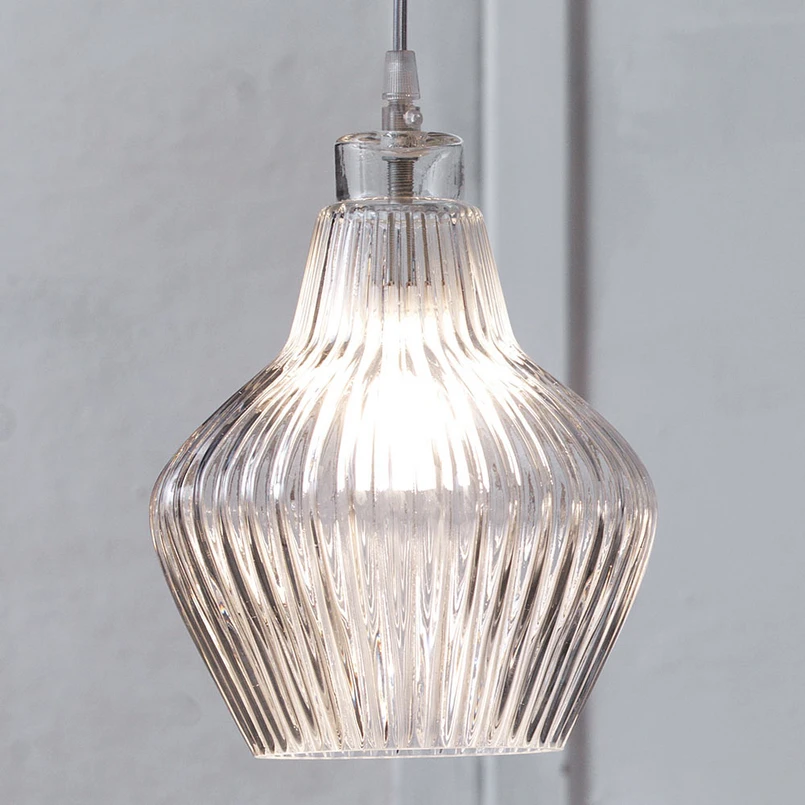 Der transparente, farblose Schirm der Hängelampe ist bauchig geformt und von Längsrillen überzogen. Das Leuchtmittel ist zum Schutz vor Blendungen und für eine bessere Lichtverteilung von einem kleinen satinierten Glaszylinder umgeben.