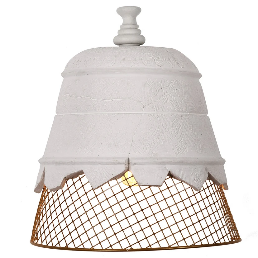 Die einen nennen es Stilbruch, die anderen sehen es als eine willkommene Ablenkung vom Gewöhnlichen, vom Alltag - ganz so, wie der Sonntag sich als "Festtag" von den anderen Tagen der Woche unterscheidet. "Domenica", also Sonntag, ist auch der Name dieser italienischen Designerleuchte, die zur einen Hälfte aus Gips, zur anderen aus einem Drahtgeflecht besteht. Die Gipshälfte ist mit einem feinen Relief versehen und am Übergang zur anderen Hälfte so gestaltet, als wären hier Stückchen vom Gips abgebrochen. Das Drahtgeflecht steht im krassen Gegensatz zu der biederen und eher klassisch wirkenden oberen Hälfte und verkörpert das Moderne, das Aufregende, das Neue, das aus dem Klassischen, Alten und Verstaubten hervorbricht.