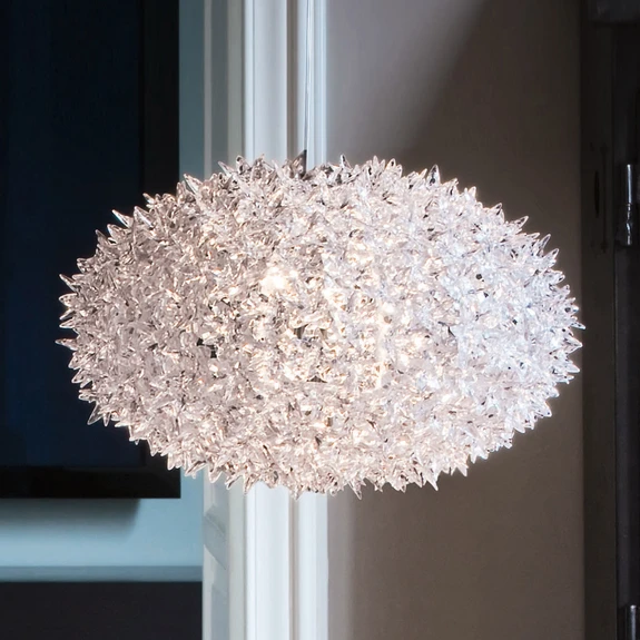 Durch mehrere auf der Innenseite des Schirms positionierten Leuchtmittel werden die kleinen Blumen mit doppelter Blumenkrone auf der Außenseite angestrahlt und verbreiten so tausendmal vervielfachte Lichtreflexe in den Raum hinein. Die von dem italienischen Designer Ferruccio Laviani entworfene Leuchte ist komplett aus Polykarbonat gefertigt und entspricht damit dem Markenzeichen des Herstellers Kartell.