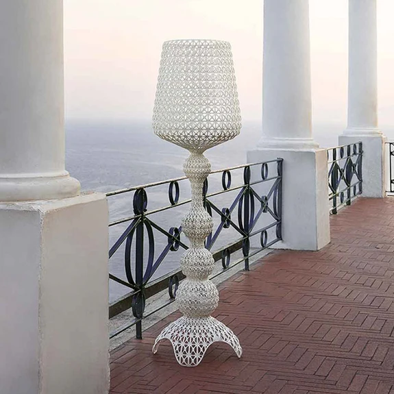 Durch die Schutzart IP44 ist das Modell Kabuki keine gewöhnliche Stehleuchte, die man in der Regel im Wohnzimmer vorfindet, sondern sie ist relativ witterungsbeständig und kann im Außenbereich eingesetzt werden. Die Terrasse, die Loggia oder der Balkon sind für so ein Schmuckstück wie Kabuki der richtige Ort, um zu glänzen. Gestell und Schirm sind gleichermaßen aus thermoplastischem Technopolymer im Spritzgussverfahren hergestellt. Mit Hilfe dieses Verfahrens kann man eine Oberfläche herstellen, die mit kleinen Auslassungen übersät ist und von der Struktur her an Spitze erinnert.