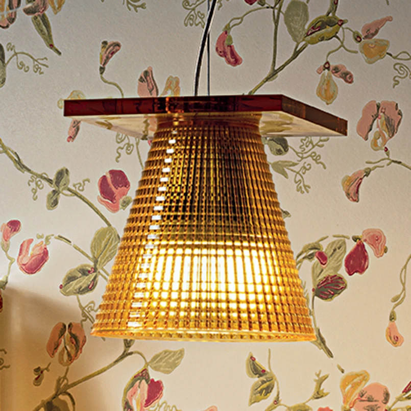 Die vollständig aus thermoplastischem Technopolymer hergestellte Hängeleuchte Light-Air wurde von Eugeni Quitllet, einem katalanischen Designer, für die Marke Kartell entworfen. Light-Air ist sehr puristisch ohne großartige Details oder eine auffällige Formgebung. Sie ist eine moderne, zweckmäßige Leuchte, die auf das Wesentliche reduziert wurde: eine Aufhängung und einen Schirm. Der Schirm, der nur an einer rechteckigen Kunststoffplatte befestigt ist, hat jedoch eine strukturierte Oberfläche, durch die das Licht gebrochen und auf eine einzigartige Art und Weise in den Raum abgegeben wird.