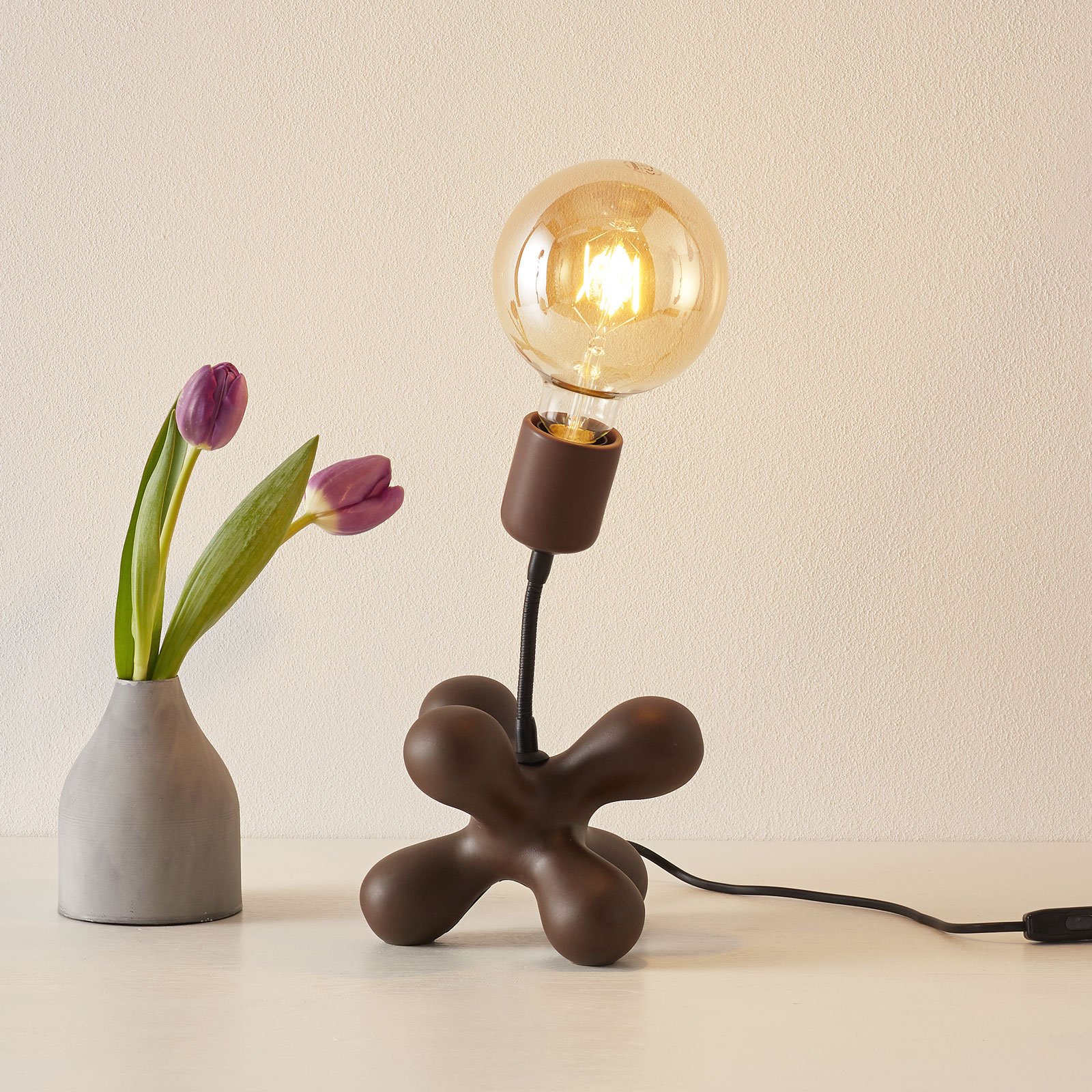 Nicht nur farbenfroh, sondern auch sehr phantasievoll ist diese Tischleuchte gestaltet. Sowohl der Fuß als auch die Halterung für die Lampenfassung sind aus Keramik. Einen Schirm hat die Leuchte nicht, was bedeutet, dass das Leuchtmittel eine prominente Rolle einnimmt. Daher sollte man ein dekoratives Leuchtmittel, z. B. Filament, wählen. Der Flexarm ermöglicht eine individuelle Ausrichtung der Lichtquelle.