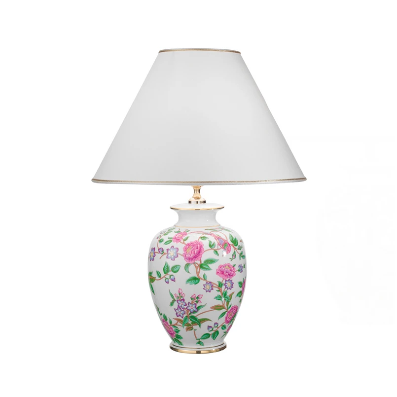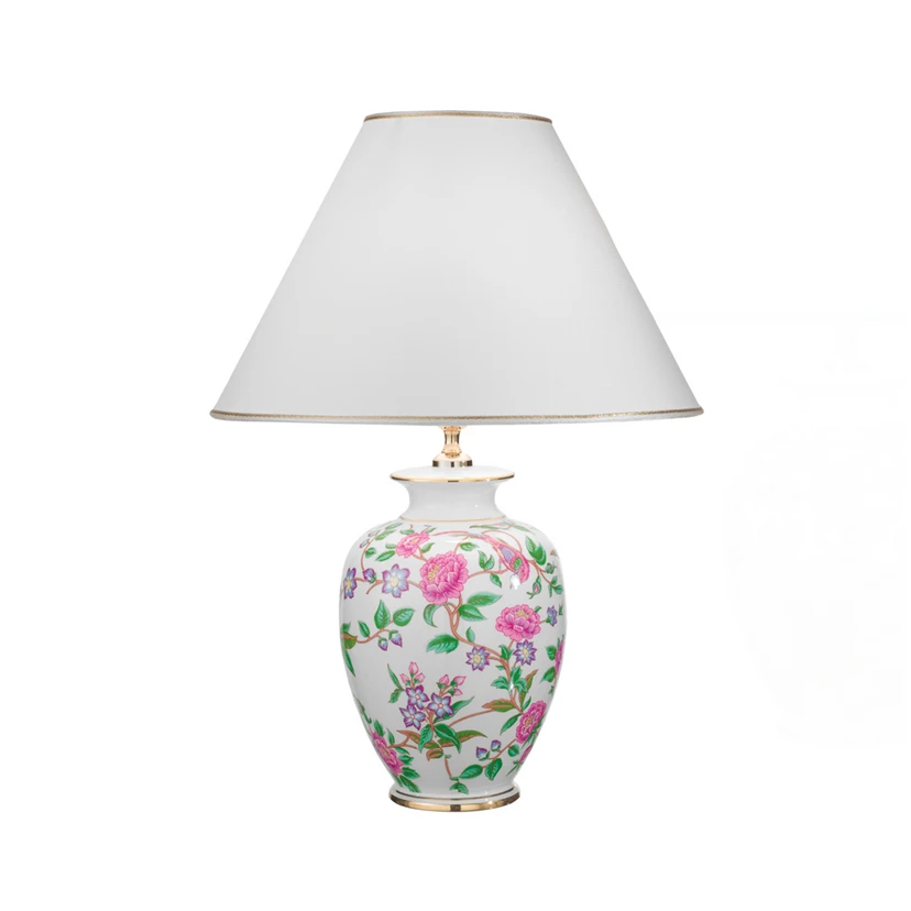 Tischleuchte Giardino Flora mit Stoffschirm und floral gemustertem Keramikfuß