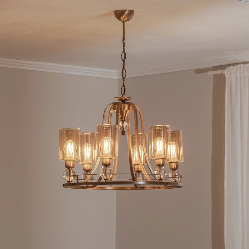 Kronleuchter Jadina, gold antik, 6-flg., Ø 62 cm Metall/Glas