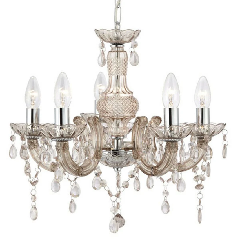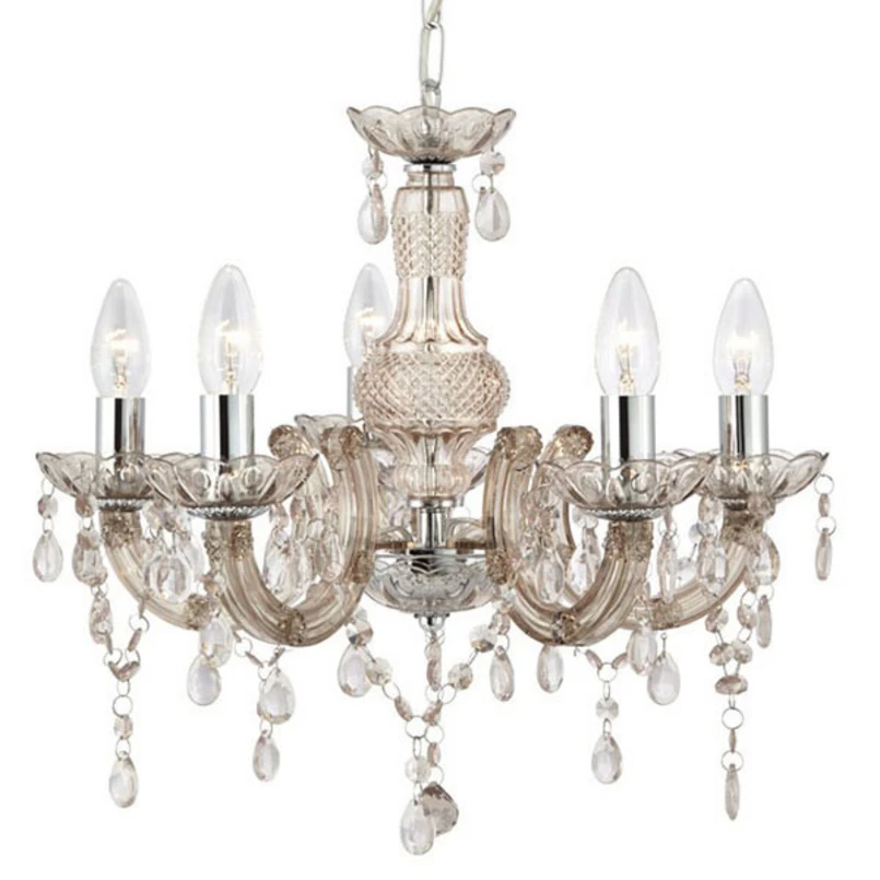 Der Kronleuchter Marie Therese überzeugt durch seine feine, grazile Optik. Er besteht aus einem ganz fein in hellem Braun gehaltenem Acryl mit abgesetzten chromfarbenen Elementen. Die Stilistik des Designs ist in Anlehnung an die klassischen, traditionellen Kronleuchter vergangener Zeiten gestaltet, mit geschwungenen Armen und kleinen kristallartigen Behängen. Der Kronleuchter Marie Therese passt so perfekt in moderne Wohnräume, zum Beispiel als Beleuchtung über einen großen Esstisch oder als gezieltes Highlight im weitläufigen Eingangsbereich.