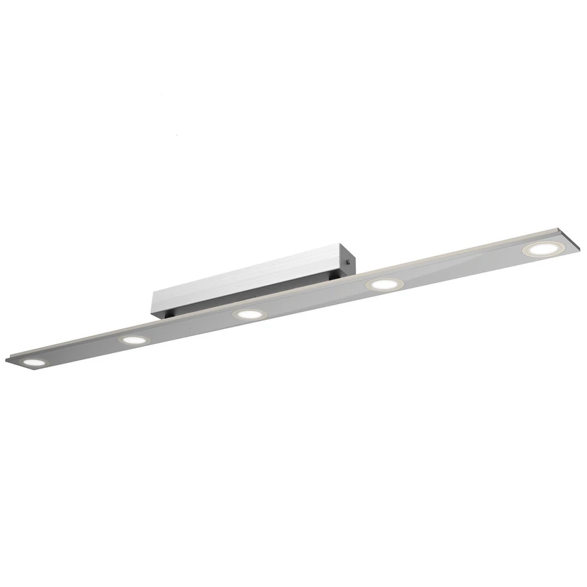 Die längliche Deckenplatte aus Edelstahl ist bei der Deckenlampe Pano mit einer Acrylabdeckung versehen. In diese Abdeckung sind fünf runde LED-Module eingebaut, die mit ihrem opalen Diffusor für ein sehr flächiges, homogenes Licht sorgen. Mit einem Farbwiedergabe-Index von Ra 85 weisen diese LEDs einen besonders guten Wert im Bereich der Wohnraumbeleuchtung auf. Im Wohnzimmer sowie im Flur oder auch im Kinderzimmer sorgt die LED-Deckenlampe für warmweißes Allgemeinlicht, das den Raum auf energieeffiziente Weise erhellt.