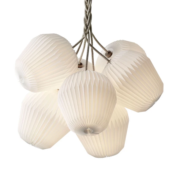 Die organisch geprägten Lampenschirme der Hängeleuchte The Bouquet hängen in einem aufregenden Bündel von der Decke herab und erzeugen ein lebendiges Bild. In rein weißer und sehr natürlicher Farbe präsentieren sich die von Hand gefalteten sieben Schirme, die aus Hart-PVC-Folie bestehen und die typisch kreuzplissierte Falttechnik aufweisen, für die das dänische Unternehmen LE KLINT so bekannt geworden ist. Jede Leuchte ist einzigartig und versprüht einen eleganten und harmonischen Touch, der vor allem durch die bewusste Wahl von Details komplettiert wird. An der Oberseite der Schirme sind filigrane Eichenholz-Elemente zu finden, an denen die natürlichen Leinenkordeln befestigt sind. Diese stellen die Aufhängung dar und sind geflochten, um den Charakter der Leuchte deutlich zu unterstreichen. Die Lichtabgabe erfolgt über die gesamte Oberfläche der Hart-PVC-Folie und verstärkt sich in der Helligkeit durch die gebündelten Schirme, die für eine großflächige und blendfreie Beleuchtung sorgen.