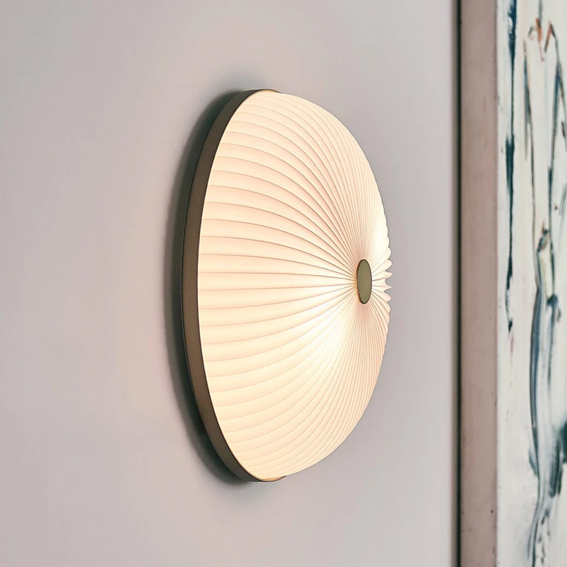 Lamella ist eine rund Wandleuchte, die problemlos auch als Deckenleuchte montiert werden kann. Sie besteht aus einem Leuchtenschirm, der aus einer Vielzahl von weißen Lamellen zusammengesetzt ist. Als optisches Highlight bilden eine kleine, runde Abdeckung in der Mitte des Schirmes und die Umrandung aus Metall einen Kontrast zum hellen Schirm. Die Leuchte wird mit zwei Leuchtmitteln bestückt (empfohlen: LED), die das Licht dank der diffusen Lichtverteilung harmonisch im Raum verteilen und für wohlige Akzente sorgen. Mit einem externen Dimmer kann Lamella auch stufenlos gedimmt werden.
