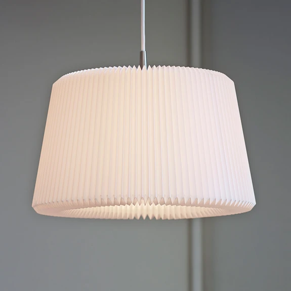 Aus weißem Kunststoff wurde der Schirm der Hängeleuchte Snowdrop von Hand gefaltet. Diese Falttechnik ist das Markenzeichen des dänischen Herstellers, der seine Leuchtenkreationen seit nunmehr 75 Jahren in Dänemark produziert. Bis heute ist es nicht gelungen, diese besondere Falttechnik duch Maschinen bewältigen zu lassen, so dass die Leuchtenschirme noch heute wie zur Gründerzeit des Leuchtenunternehmens von professionellen Falterinnen und Faltern in Handarbeit gefertigt werden, so dass jeder Leuchtenschirm zum Unikat wird.