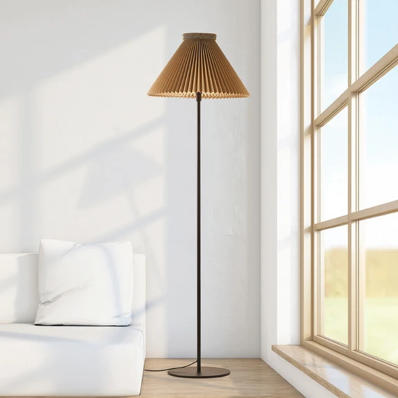 Die LE KLINT Stehleuchte LK 334 vereint skandinavische Designästhetik mit hochwertiger Handwerkskunst und sorgfältig ausgewählten Materialien. Der handgefaltete Lampenschirm aus Papier verleiht der Leuchte eine filigrane Leichtigkeit und streut das Licht sanft und gleichmäßig in den Raum, wodurch eine warme, harmonische Atmosphäre entsteht. Der stabile Stahlfuß in Schwarz setzt einen klaren, eleganten Kontrast zu den hellbraunen Tönen des Schirms und sorgt für sicheren Stand. Zusammen bilden sie ein stimmiges Gesamtbild, das sich mühelos in unterschiedlichste Wohnräume wie Wohnzimmer oder Schlafzimmer einfügt.