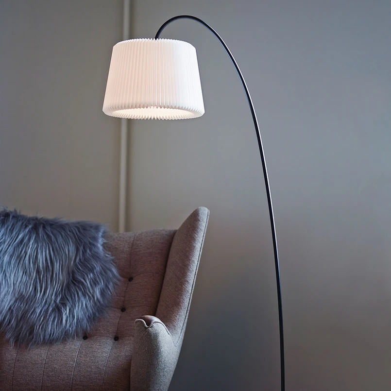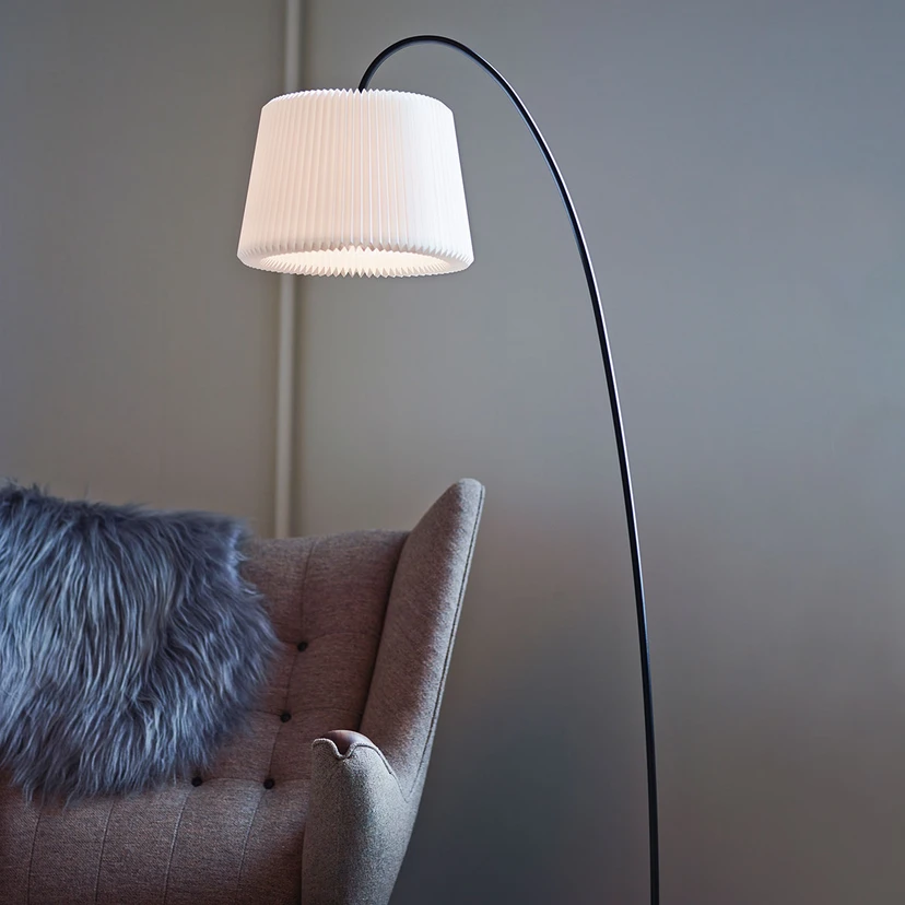 Die Designer-Stehleuchte Snowdrop ist eine Leuchtenkreation des Designer-Trios Harrit-Sørensen + Samson und wird vom dänischen Leuchtenhersteller Le Klint produziert. Der Aufbau besteht aus einem schwarzen Metallgestell mit rundem Fuß und gebogenem Ständer, der den charakteristischen weißen Lampenschirm in Faltenoptik trägt. Hinzu kommt ein Textilkabel.