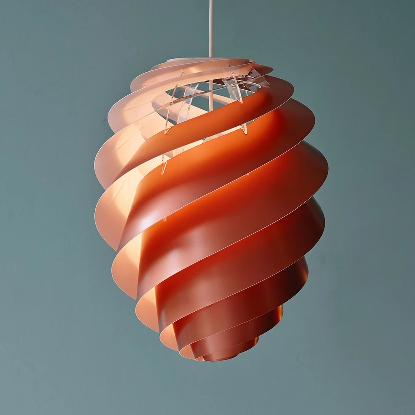 Der dänische Designer Øivind Slaatto holt sich viele seiner Inspirationen aus der Natur. Besonders angetan hat es ihm die Schnecke. Ihr Haus scheint auch die Vorlage für die Pendelleuchte Swirl zu sein, die mit ihren Drehungen und Windungen entfernt an ein Schneckenhaus erinnert. Sein Motto lautet: Licht, Form und Funktion einer Leuchte sollten nach Möglichkeit immer eine Symbiose eingehen. Bei der Pendelleuchte ist er seinem eigenen Motto offensichtlich gerecht geworden. Getreu dem skandinavischen Stil erscheint Swirl in einem zeitlosen und funktionellen Design, dem es trotz aller Schlichtheit und Funktionalität nicht an Raffinesse mangelt. Die Kunststoffelemente, aus denen der Schirm zusammengesetzt ist, sind auf der Unterseite weiß und auf der Oberseite kupferfarben.