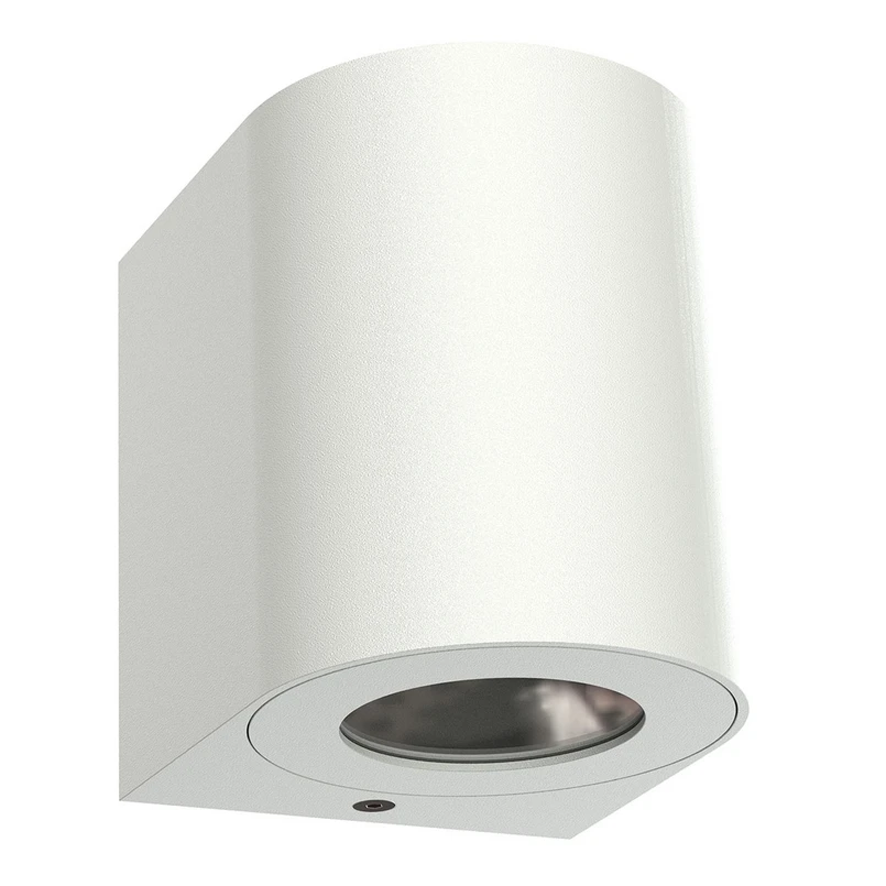 Die LED-Außenwandleuchte Canto 2 ist als Quader geformt, der an der Vorderseite abgerundet ist und hier einem Zylinder entspricht. Der aus Aluminium-Spritzguss gefertigte Korpus verfügt an Ober- und Unterseite über runde Öffnungen, die mit klaren Glasabdeckungen besetzt sind. Die dahinter liegenden LEDs emittieren in einem Ausstrahlwinkel von 120 ° warmweißes Licht, das in der Form von Up-and-Down-Beleuchtung den Außenbereich erhellt. Mitgelieferte Schablonen bieten zudem die Option, mittels gezielt gestalteter Lichtmuster an der Wand dekorative Akzente zu erzeugen.
