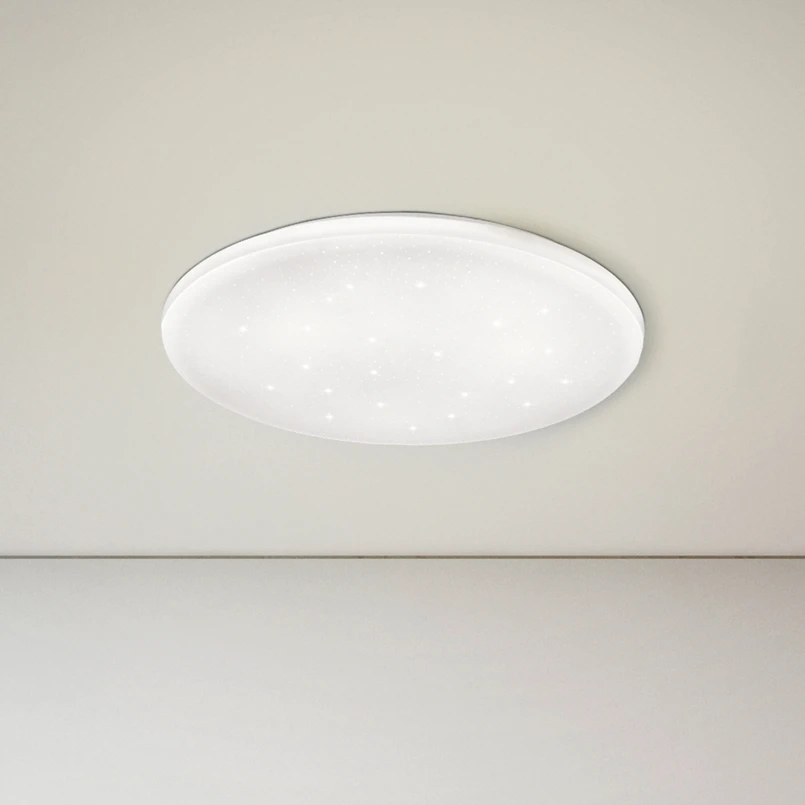 Eine fast universell in jedem Raum und jedem Ambiente einsetzbare Lichtquelle zur Allgemeinbeleuchtung stellt die LED-Deckenleuchte Frania-S dar. Das Deckenelement der Leuchte besteht aus Stahl, der Leuchtenschirm aus Kunststoff. Der Schirm ist mit einem Kristalleffekt gearbeitet, der im ausgeschalteten Zustand kaum zu sehen ist. Sobald die Leuchte jedoch eingeschaltet wird, erscheint am Schirm ein funkelnder Sternenhimmel, auf dem kleinere und größere Sterne funkeln wie Kristalle.