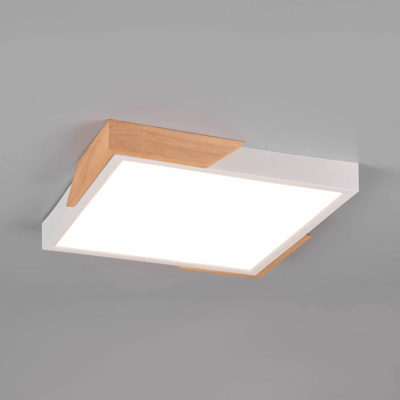 Die LED-Deckenleuchte Meta ist in der Form eines quadratischen Anbaupanels gestaltet und besteht aus Kunststoff. Das Gehäuse ist an zwei der vier Ecken mit feinen Holzelementen versehen. Mit ihren warmweißen LEDs und dem lichtstreuenden Diffusor sorgt Meta für eine angenehme und großflächige Beleuchtung.