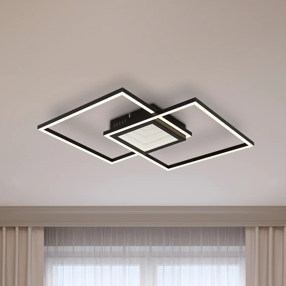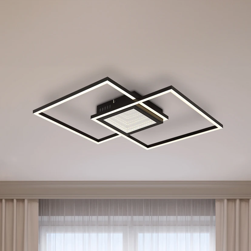 Die Deckenleuchte Saunders im quadratischen Design mit zwei übereinander liegenden und versetzten Quadraten bietet eine moderne Beleuchtungslösung. Der schwarze Metall-Korpus und der Schirm aus Aluminium in Schwarz, Matt und opalem Kunststoff erzeugen einen beeindruckenden 3D-Effekt. Mit einem hohen Lichtstrom und der steuerbaren Lichtfarbe (CCT) von Warmweiß bis Tageslicht bleiben bei der LED-Deckenlampe Saunders keine Wünsche offen.