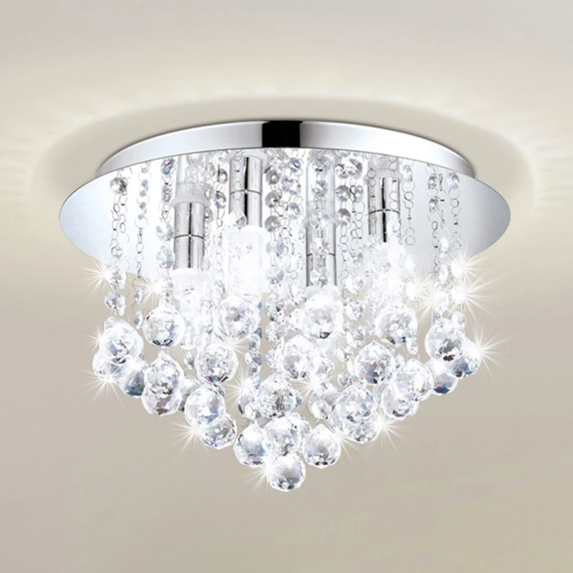 Eine runde, verchromte Deckenplatte stellt die Basis der LED-Deckenleuchte Almonte dar. An ihr hängen unzählige Ketten mit kleinen, flachen und größeren kugelförmigen, geschliffenen Elementen aus Kristallglas herab, die nach unten in der Mitte spitz zulaufend angeordnet sind. G9 LED-Lampen in den Fassungen bringen die Kristalle zum Funkeln und spenden gleichzeitig eine warmweiße Grundbeleuchtung im Raum. Durch die Spiegelung der Kristallelemente im verchromten Deckenelement erscheint die Deckenleuchte Almonte noch schillernder.