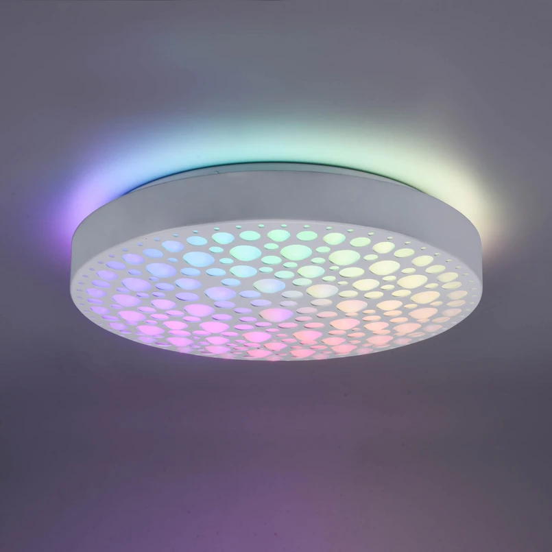 Die aus Kunststoff gefertigte LED-Deckenleuchte Chizu ist an der Unterseite mit einem Muster aus unterschiedlich großen, runden Öffnungen versehen, durch die das Licht austritt. Die integrierten LEDs sind dimmbar und in der Farbtemperatur (warmweiß bis tageslicht) regelbar, zudem können auch bunte Lichtfarben oder ein dezentes Nachtlicht eingestellt werden. Alle Optionen werden bequem mit der beiliegenden Fernbedienung gesteuert.