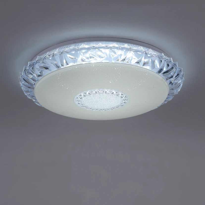 Die runde LED-Deckenleuchte Lucca überzeugt auf den ersten Blick durch ihre Gestaltungselemente, die an Kristalle erinnern, und den milchigen Diffusor mit leichtem Glitzereffekt. Dazu können die LEDs der Leuchte in verschiedenen Weißtönen oder in farbigem Licht erstrahlen, je nach gewünschter Lichtstimmung. Geschaltet wird dies alles über die mitgelieferte Fernbedienung, die auf Knopfdruck das gewünschte Licht erzeugt. Hiermit kann die Leuchte nicht nur ein- oder ausgeschaltet, gedimmt oder in der Lichtfarbe geändert werden, auch ein automatischer Farbwechsel oder eine zeitliche Steuerung ist möglich.