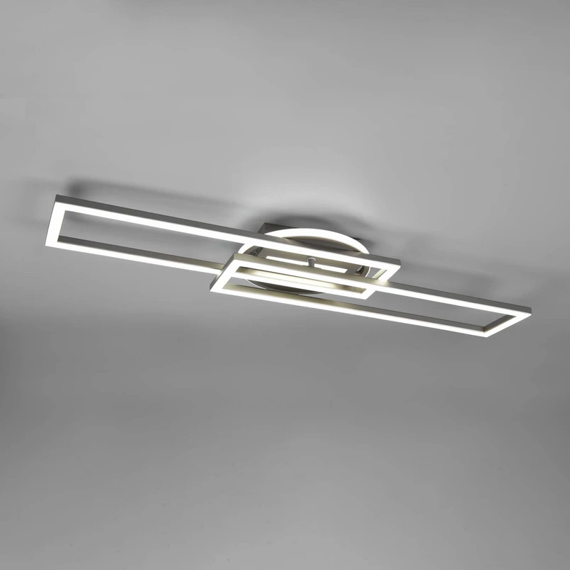 Die LED-Deckenleuchte Twister besitzt gleich vier Abschnitte mit integrierten LEDs - ein Rechteck unterhalb des Baldachins, einen darum verlaufenden Ring sowie zwei rechteckige Rahmen. Der untere davon lässt sich horizontal drehen, sodass die Gestaltung der Deckenleuchte Twister stets neu angepasst werden kann. Letzteres gilt auch für das Licht; per mitgelieferter Fernbedienung lässt sich Twister Dimmen und von warmweiß bis tageslicht in der Lichtfarbe regeln, sodass für nahezu jede Situation die passende Beleuchtung bereit steht. Nach dem erneuten Einschalten wird die zuletzt gewählte Einstellung reaktiviert. Auch über jeden herkömmlichen Wandschalter ist das Dimmen in drei Helligkeitsstufen (100 %, 50 %, 25 %) möglich.
