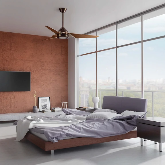 Jade lässt sich über die enthaltene Fernbedienung in drei Geschwindigkeiten schalten. Die verbaute LED-Lampe spendet gemütliches warmweißes Licht, dessen Helligkeit über die Fernsteuerung komfortabel stufenlos gedimmt werden kann.
