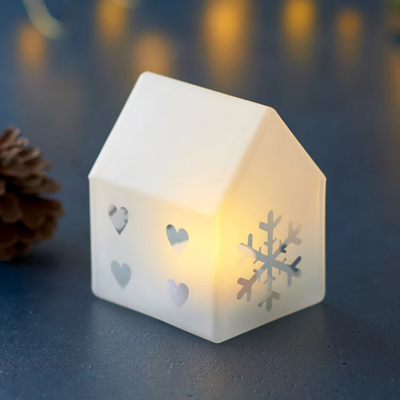 Dieses Dekorationsobjekt erinnert an das Haus vom Nikolaus. Es besteht aus gefrostetem Glas und weist an den Fassaden klare "Fenster" in Schneekristall- und Herzform auf.