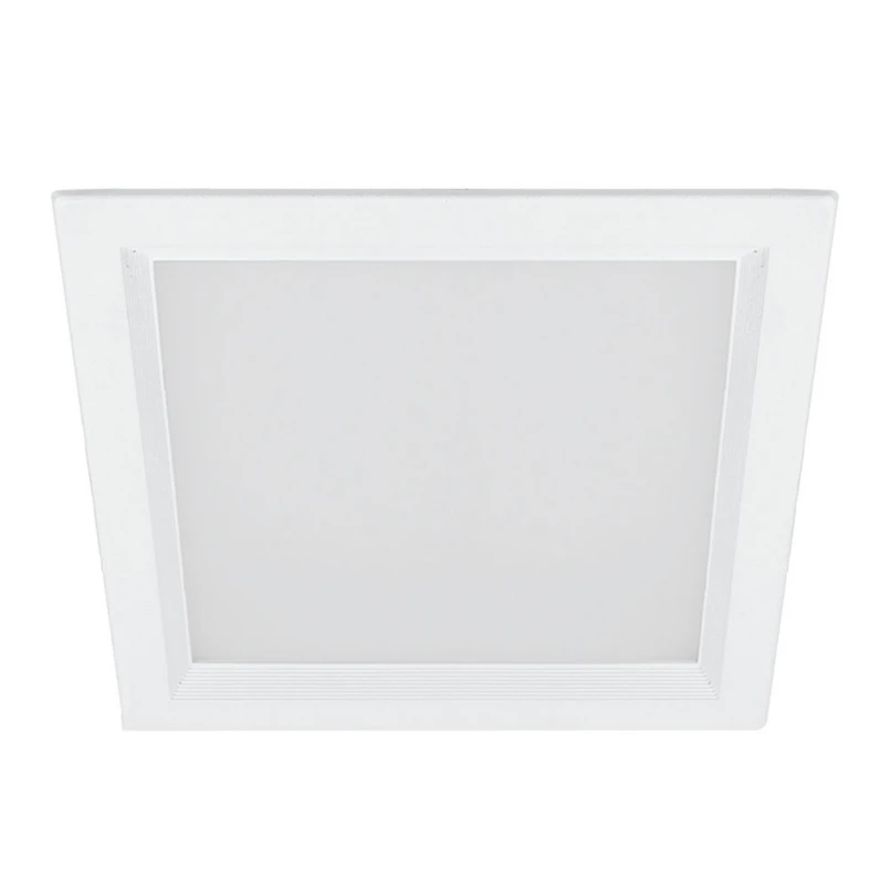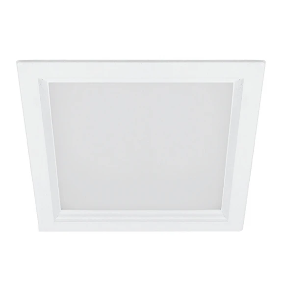 Der weiß lackierte Rahmen aus Aluminium-Druckguss umfasst einen leicht zurückversetzten, ebenfalls quadratischen Diffusor, dessen opale Scheibe für eine gleichmäßige Lichtstreuung sorgt. Der rückseitige Aluminium-Kühlkörper verschwindet unsichtbar oberhalb der Öffnung in der Decke; Letztere sollte 1 bis 2 cm stark sein.