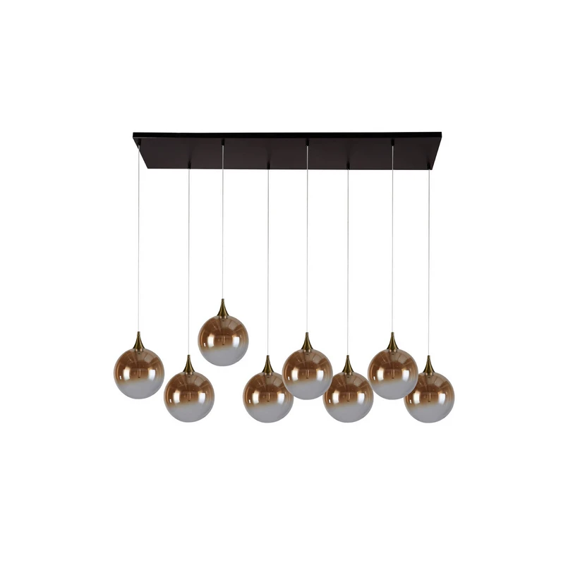 Die LED-Hängeleuchte Alchemy mit ihren acht bernsteinfarben getönten Schirmen aus Glas ist eine atemberaubende Leuchte, die sich perfekt für eine Küche, ein Esszimmer oder eine Hausbar eignet. Der lange Baldachin besteht aus schwarzem Metall, von ihm hängen unterschiedlich positionierbar acht Leuchtenschirme in Kugelform mit bernsteinfarbener Tönung und goldenen Akzenten an der Aufhängung ab. Die exquisiten Ombre-Braunglastöne erzeugen einen auffälligen visuellen Effekt. Diese vielseitige Pendelleuchte bietet eine Rundumbeleuchtung und verwandelt jeden Raum in eine Oase einladender Atmosphäre. Die Leuchte ist mit einem per Triac dimmbaren Betriebsgerät ausgestattet.