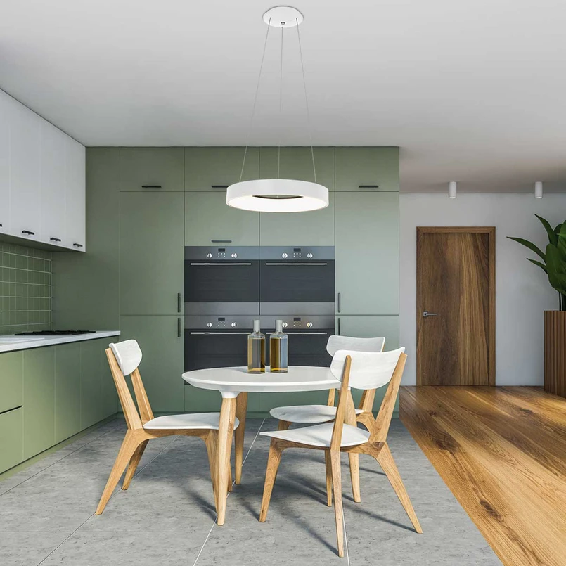 Diese modern designte Hängeleuchte eignet sich für die Grund- und Bereichsbeleuchtung, z. B. im Wohn-Esszimmer oder in der Küche. Die warmweiß leuchtenden LEDs sind auf der Innenseite des ringförmigen Schirmelements verbaut und erzeugen einen hohen Lichtstrom sowie ein sehr behagliches Licht.