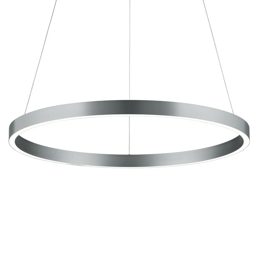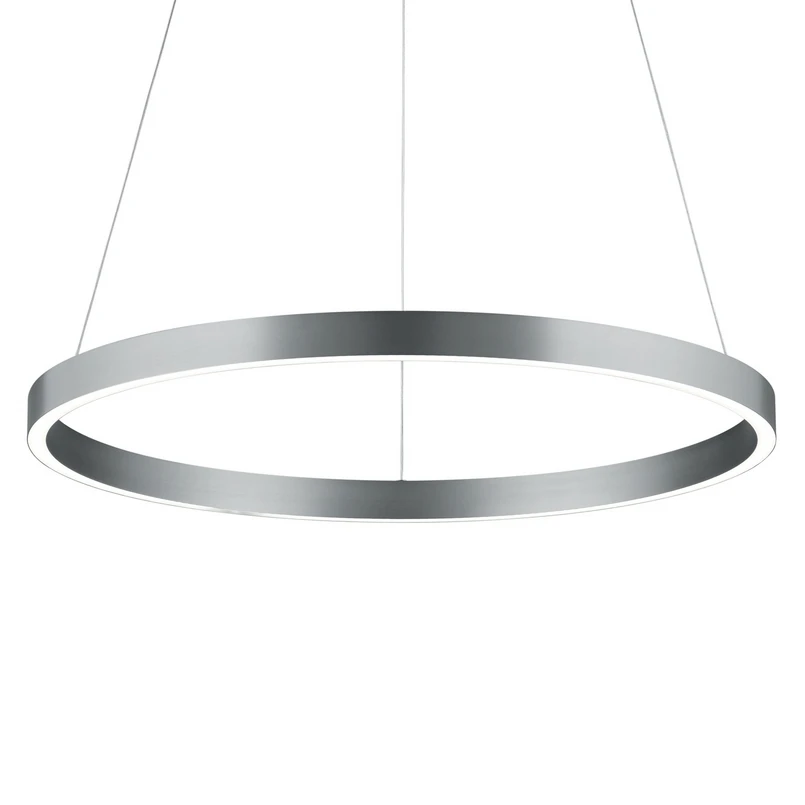 Die LED-Hängeleuchte Svea-L 60 hebt sich optisch durch ihre Form hervor. Ein Ring, bestückt mit durchgehenden LEDs an Ober- und Unterseite, ist an drei Pendeln befestigt. Die schlichte Eleganz, die von der Leuchte in matter Nickeloptik ausgeht, lässt sich harmonisch in viele modern eingerichtete Räume integrieren.