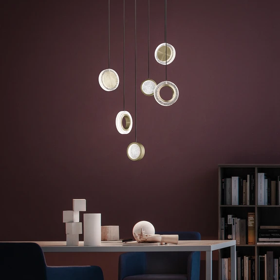 Für die Beleuchtung sorgen in die Schirme eingelassene LED-Strips, die mit ihrer warmweißen Lichtfarbe für eine angenehme Atmosphäre sorgen und darüber hinaus eine sehr gute Farbwiedergabe aufweisen (CRI>90). Ein absoluter Blickfang, nicht nur in eingeschaltetem Zustand. Der Designer Claudio Saccon entwarf diese Serie für die Leuchtenmanufaktur Sillux, die diese elegante Hängeleuchte in Italien produziert.