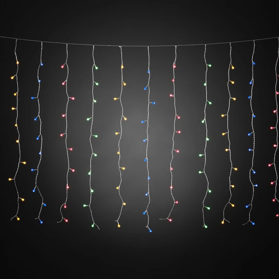Der LED-Lichtervorhang besteht aus unterschiedlich langen, nebeneinander aufgereihten Strängen, die mit bunt leuchtenden Globe-LEDs besetzt sind. Der Lichtervorhang ist ein schönes Dekoaccessoire für die lichtvolle Inszenierung von Dachrinnen und Geländern. Mit Spritzwasserschutz (IP44) gegen stärkere Witterungseinflüsse geschützt. Ein 24-Volt-Außentransformator gehört zum Lieferumfang. Mit transparentem Kabel bestückt.