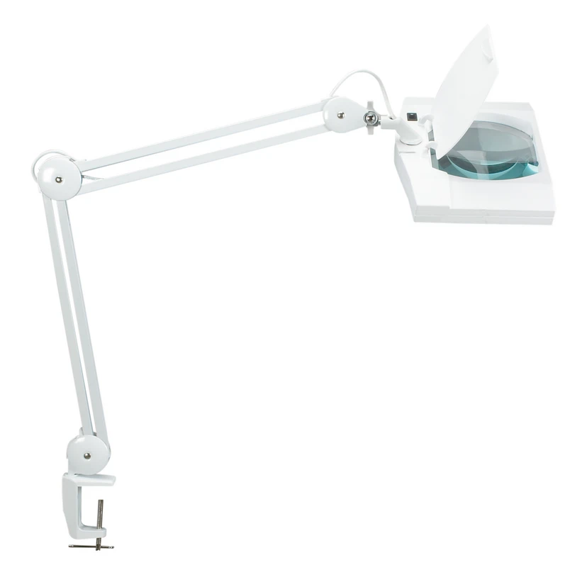 Die praktische LED-Tischleuchte kann ideal für den privaten Bereich aber auch in Werkstätten oder Büros genutzt werden, denn sie spendet nicht nur Licht, sondern verfügt auch über eine verbaute Lupe für akkurate Arbeiten. Diese vergrößert durch die 3 Dioptrien-Linse um das 1,75-fache. Der Leuchtenkopf ist flexibel dreh- und neigbar und sorgt so für das perfekte Licht. Auch der robuste Parallelogramm-Metallarm kann um 360° gedreht werden. So lässt sich die Klemmleuchte in beliebige Positionen bringen und verschafft so Erleichterung am Arbeitsplatz. Dank des Schalters am Leuchtenkopf ist ein komfortables Ein- und Ausschalten gewährleistet.