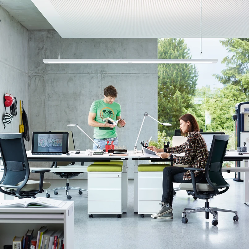Durch einen IR-Bewegungssensor und einen Tageslichtsensor, die in der Leuchte integriert sind, wird das Licht jederzeit auf die Lichtverhältnisse und die Anwesenheit von Personen in der Umgebung angepasst und so immer eine perfekte Beleuchtung am Arbeitsplatz sichergestellt. Eine Bedientaste im Leuchtenkopf erlaubt die Justierung des Lichts direkt am Leuchtengehäuse, wobei direkter und indirekter Anteil separat steuerbar sind.