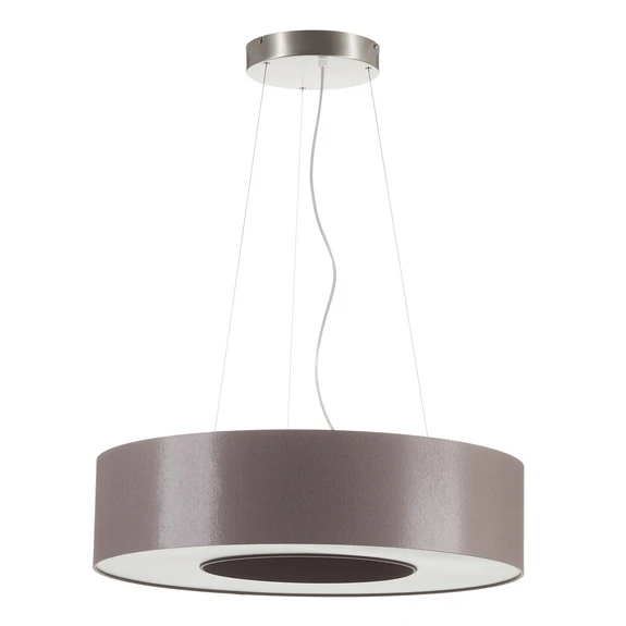 Die Namensgebung dieser Pendelleuchte Donut lässt bereits auf die Form schließen, denn diese runde LED-Leuchte hat im Inneren einen Freiraum, durch den der Betrachter den runden Deckenbaldachin und die drei Pendelstahlseile erkennen kann. Der Leuchtenschirm von Donut ist aus Chintz gefertigt und an der Unterseite mit einer Polycarbonatabdeckung in Weiß verkleidet. Die dahinter befindlichen LEDs sind fest verbaut und strahlen das Licht blendfrei in den Raum und leisten einen indirekten Lichtanteil von 10 Prozent. Die Helligkeit kann individuell über einen Phasenabschnittdimmer reguliert werden.