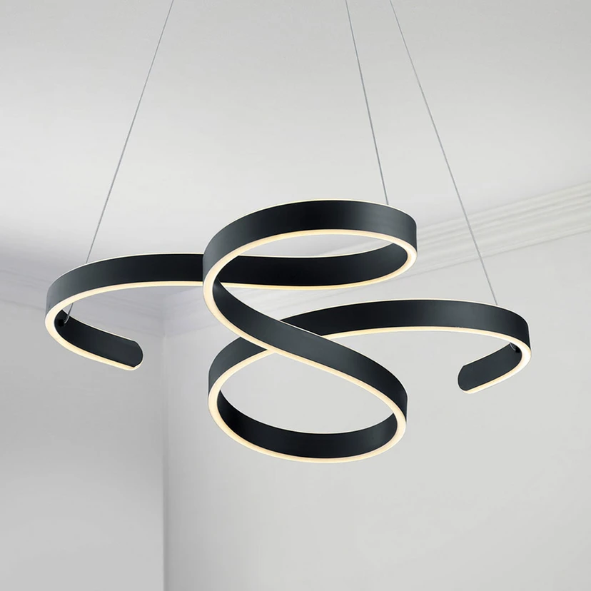 Die LED-Pendelleuchte Francis wirkt bereits ausgeschaltet als absoluter Blickfang im Raum. Ihr Schirm besteht aus einem breiten Metallband, das sich effektvoll durch den Raum schlängelt. Als Lichtquelle sind leistungsstarke LEDs in der Lichtfarbe Warmweiß verbaut, die einen hohen Lichtstrom erzeugen und so für eine helle und behagliche Umgebungsausleuchtung sorgen.