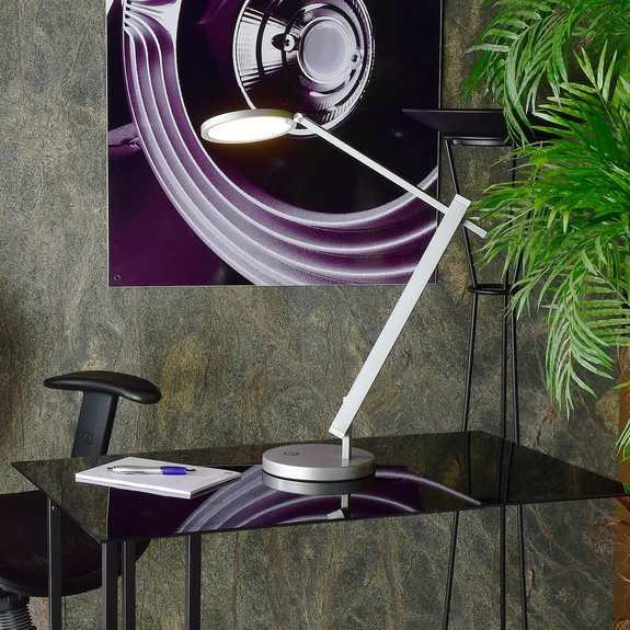 Adhara ist ein funktionales Ausstattungselement für moderne Büroräume und Arbeitszimmer. Die LED-Tischleuchte überzeugt auf dem Schreibtisch mit ihrer Ausrichtbarkeit und regelbarem Lichtoutput. Hierzu ist das aus Aluminium gearbeitete Gestell mit insgesamt drei Gelenken ausgestattet, um Höhe, Orientierung und Ausladung anzupassen. Die im runden Kopf hinter einer satinierten Abdeckung integrierten LEDs emittieren warmweißes Licht in breitem Winkel, das über den Schalter am Fuß nicht nur geschaltet, sondern auch in drei Stufen bis minimal 10 % gedimmt werden kann.