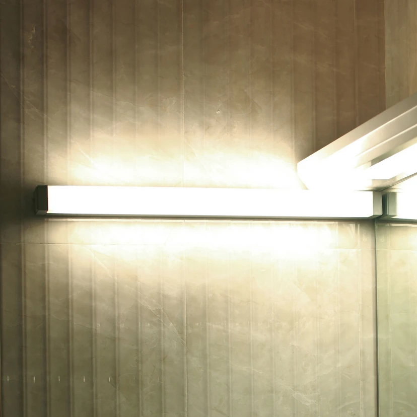 Diese moderne Wandleuchte setzt das Spiegelbild perfekt in Szene, denn durch die opale Kunststoffabdeckung wird der Lichtschein blendfrei abgegeben, aber dennoch eine gute gleichmäßige Ausleuchtung erzielt. Auch im Flurbereich könnte diese eckige Leuchte mit ihren festverbauten LEDs eingesetzt werden.
