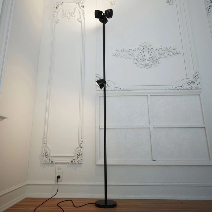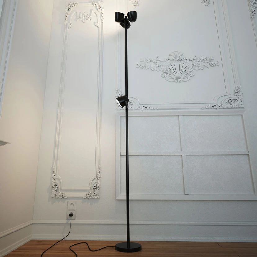 Diese aus Stahl gefertigte LED-Stehleuchte trägt den Namen Trio und ist modern designt. Am oberen Ende der grazilen Stange sind in gebündelter Form drei halbrunde, kleine Schirme montiert. Diese sind beweglich und lassen sich in unterschiedliche Richtungen drehen um ein flexibles Lichtkonzept zu gestalten. Das warmweiße Licht wird gezielt und punktuell abgestrahlt, da die Schirme durch das Material rundherum lichtundurchlässig sind. Die Lichthelligkeit lässt sich mühelos über einen integrierten Taster dimmen, außerdem ist so eine Bedienung an Ort und Stelle möglich.