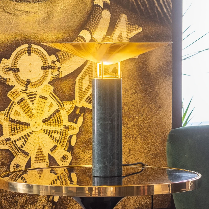 Ob im privaten Wohnbereich oder im Café - die LED-Tischlampe Rebound des aus Israel stammenden Designers Dan Yeffet begeistert mit ihrer eleganten Materialkomposition und zeitlosen Formgebung. Ihr Fuß ist als Zylinder gestaltet und aus grünem Marmor gearbeitet, an der Oberseite befindet sich die Fassung mit austauschbarer GU10 LED-Lampe. Oberhalb ist ein trichterförmig gewölbter Schirm aus Messing angebracht, der das Licht nach unten und zu den Seiten reflektiert. Zudem strahlt das Licht durch eine kleine runde Öffnung nach oben, sodass auch eine indirekte Beleuchtung über die Decke erzielt wird.
