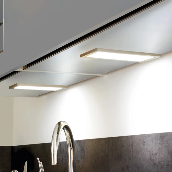 Die Unterbauleuchte LED Sky kommt gleich in zweifacher Ausführung inklusive eines LED-Trafos 24/30W für die Inbetriebnahme. Die langlebigen, eingebauten LEDs haben eine helle und großflächige Lichtentwicklung, sodass die Leuchten sich vor allem als Arbeitslicht in der Küche eignen. Dank dem flachen Gehäuse aus Kunststoff sind sie unter einem Hängeschrank oder in einem Regal kaum sichtbar.