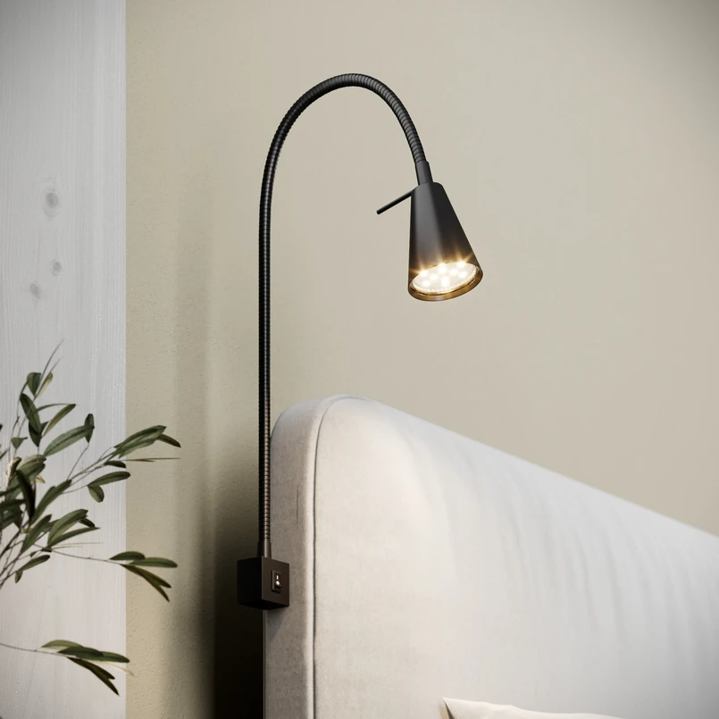 Ob links, rechts oder oben am Bett - durch die um 90° seitlich verstellbare Montageplatte kann die LED-Wandleuchte Tuso überall montiert werden. Der lange Flexarm bietet größte Flexibilität in der Ausrichtung des Lichts, so dass die Lichtposition optimal für die abendliche Bettlektüre ausgerichtet werden kann. Der Schalter wurde in die eckige Basis der Leuchte integriert, so dass er bequem vom Bett aus zu erreichen ist. Die LED-Wandleuchte Tuso wird mit einem auswechselbaren GU10 LED-Leuchtmittel geliefert, die Länge des transparenten Kabels beträgt 180 cm.