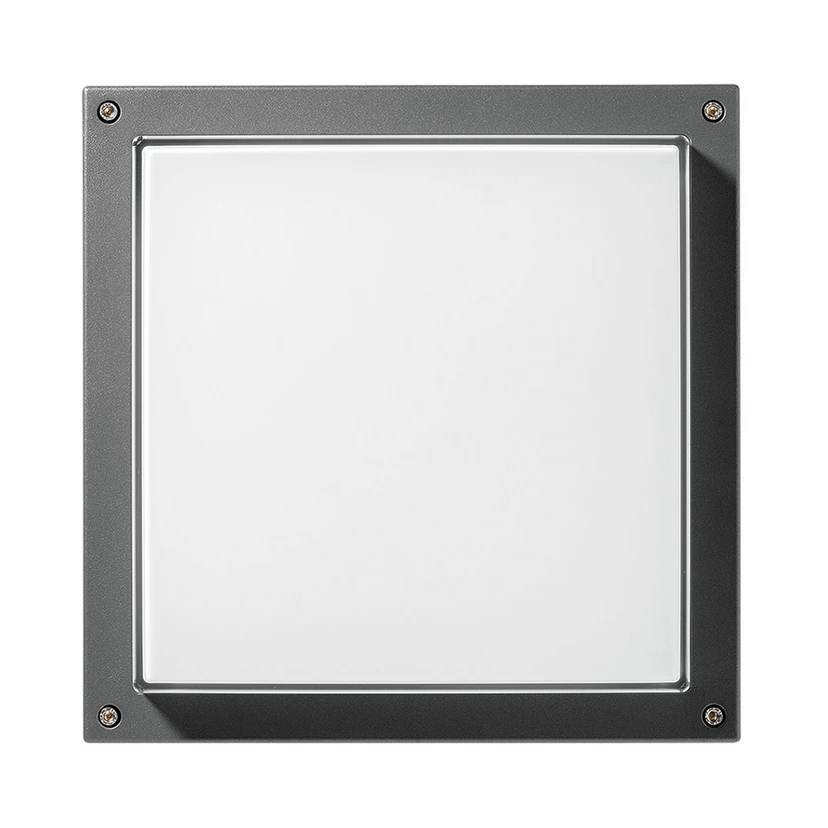 Die quadratische Wandleuchte Bliz Square 40 besteht aus einem Gehäuse, das aus Aluminiumdruckguss gearbeitet wurde. Der Diffusor ist aus Pressglas, innen lackiert und weiß gehalten. Die Dichtungen sind aus Silikon.