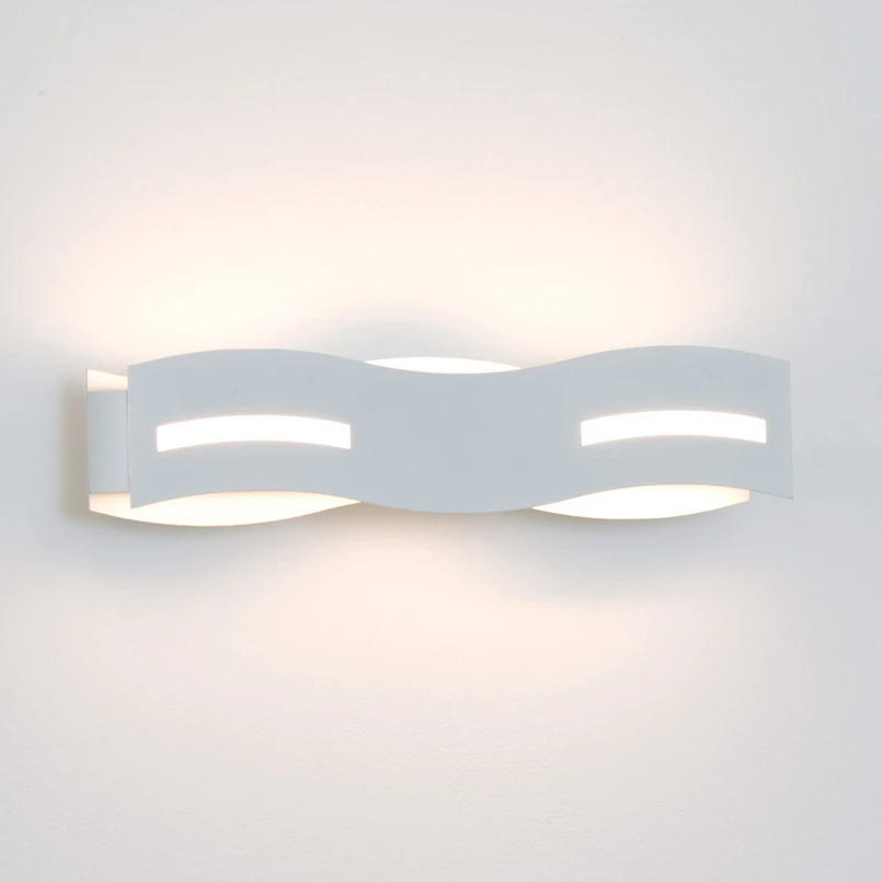 Die LED-Wandleuchte Wave macht ihrem Namen alle Ehre. Die Front besteht aus einem wellenförmig gebogenen Metallelement, das zwei längliche Öffnungen hat, durch die das Licht in den Raum flutet. Außerdem ist sie nach oben und unten geöffnet und erzeugt so einen indirekten Lichteffekt. Das schlanke, wellenförmige Design passt hervorragend zu einem modernen Einrichtungsstil und ergänzt die Hauptbeleuchtung mit indirektem Licht.