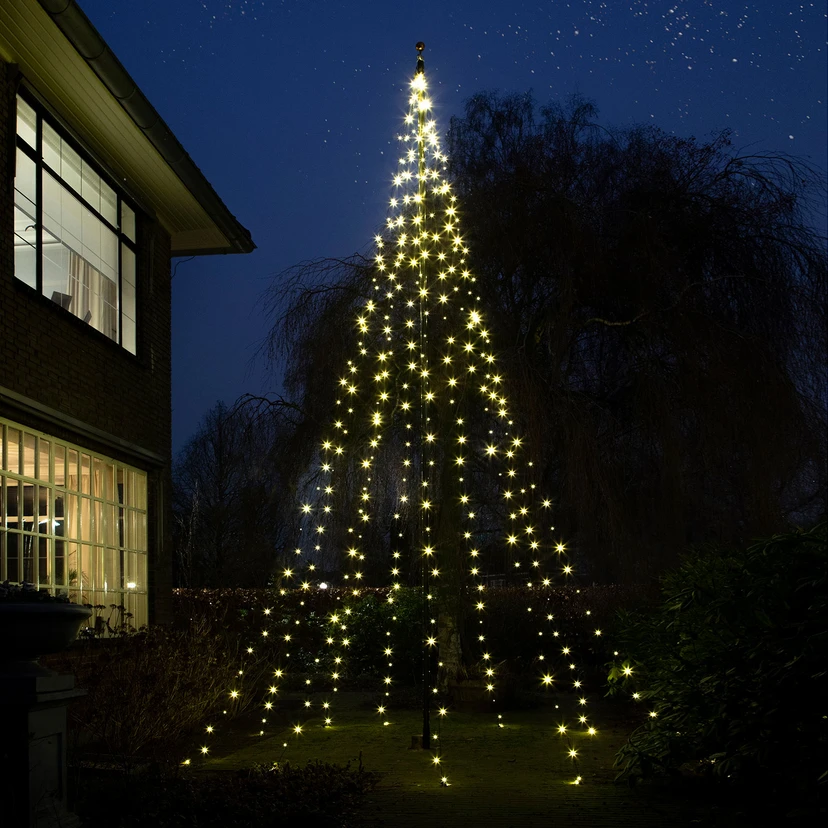 Dieser Weihnachtsbaum wird aus zehn LED-Ketten gebildet, die auf bereits vorhandenen oder zusätzlich erhältlichen Masten (siehe Zubehör) angebracht werden können. Mit den zahlreichen warmweißen LEDs und der stattlichen Größe wird diese leuchtende Weihnachtsbaum-Silhouette ein von weitem sichtbares Element der festlichen Außendekoration.